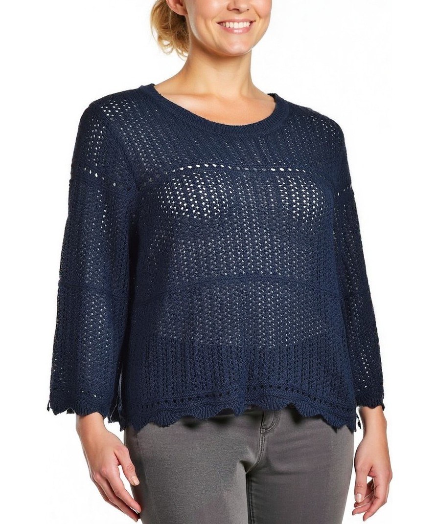 Дамски памучен пуловер в тъмносиньо с ефектна ажурна плетка. Свободна кройка, 3/4 ръкави и вълнообразен подгъв. Лек, дишащ модел за ежедневен и небрежен стил. Мие се лесно, подходящ за пролет/лято. XL