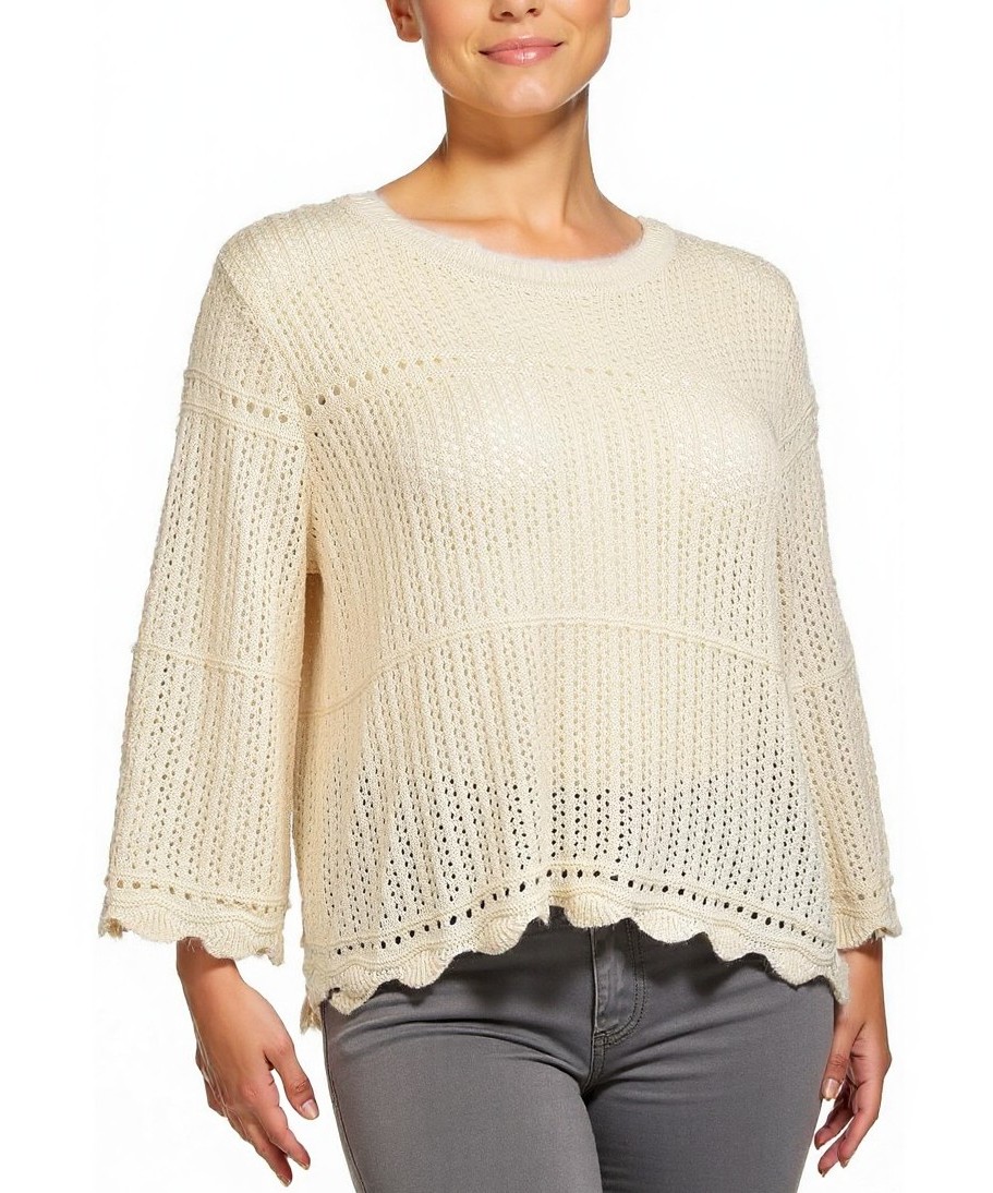Елегантен дамски пуловер от 100% памук в кремав нюанс. Свободна кройка с ажурна плетка, кръгло деколте, 3/4 ръкави и деликатен вълнообразен подгъв. Мек и дишащ. Подходящ за всеки ден и елегантни визии.