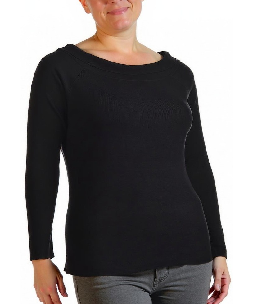 Елегантен дамски пуловер от вискоза в класическо черно. Мек и дишащ материал, прав силует с лодка деколте и дълги ръкави. Универсален модел за работа и свободно време.