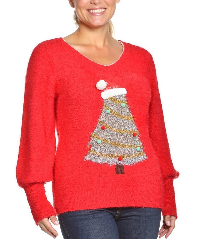 Дамски пуловер от вискоза в ярко червено, мек и пухкав ефект. Дълги ръкави, V-образно деколте и празнична коледна апликация с помпон и цветни топчета. Удобен, стилен и топъл избор. В перфектен подарък
