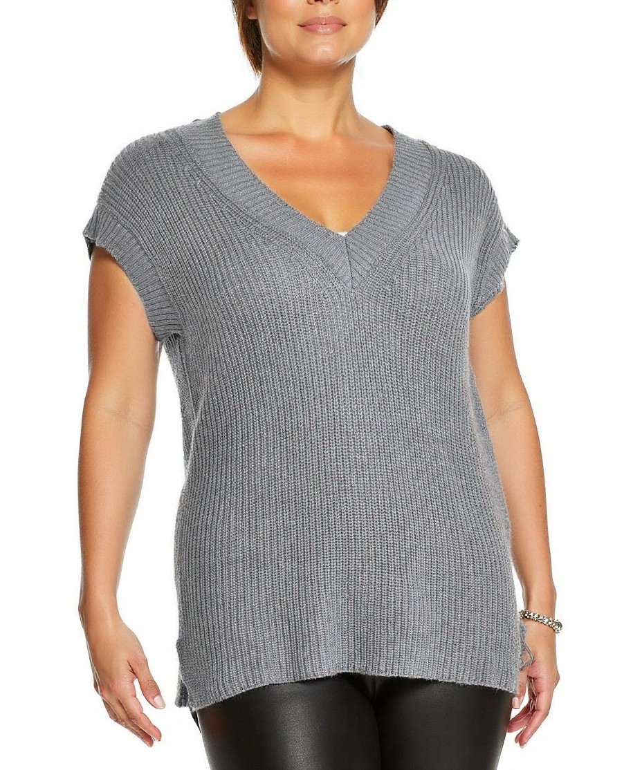 Мек дамски пуловер от 100% памук в сиво, с V-образно деколте, къс ръкав и свободна кройка. Дължина до ханша, фини релефни плетки и странични цепки за комфорт и стил. Практичен избор за всеки ден 100%.