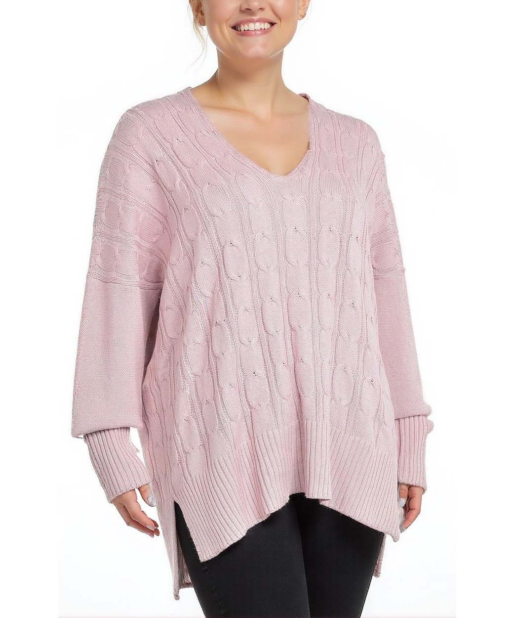Дамски памучен пуловер в нежно розово. Оверсайз с V-образно деколте, плетена шарка, рипс ръкави и странични цепки. 100% памук, лесна поддръжка, различни размери. Идеален за вечер: с дънки или пола. XL.