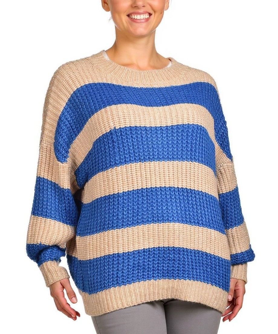 Дамски пуловер с оверсайз силует и широки бежови и сини райета. Мека плетка, кръгло деколте и обемни ръкави. Топъл, уютен модел за ежедневно носене и студените дни. Перфектен с дънки и ботуши. Стилен100%