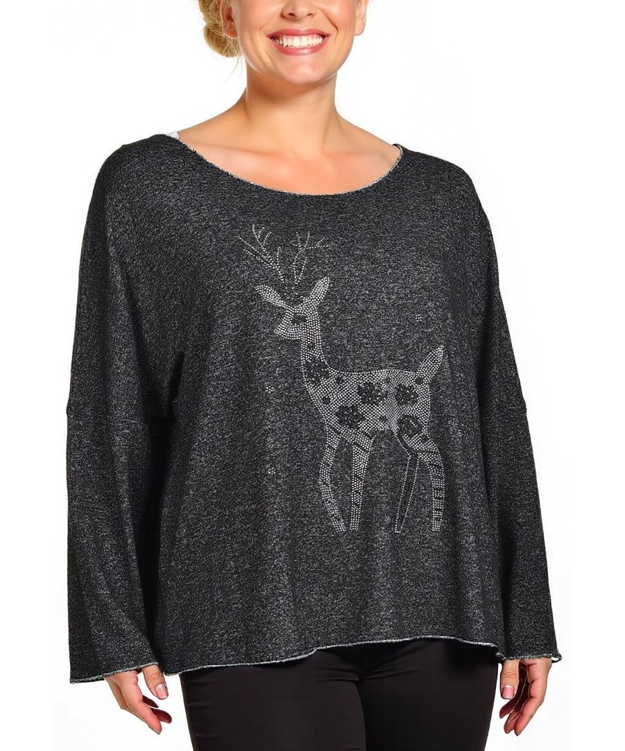 Мек дамски пуловер от вискоза с ефектна еленска апликация от кристали. Свободна кройка, дълъг ръкав и лек блясък. Подходящ за всекидневна и празнична визия, удобен и стилен. Машинно пране, не гладете.