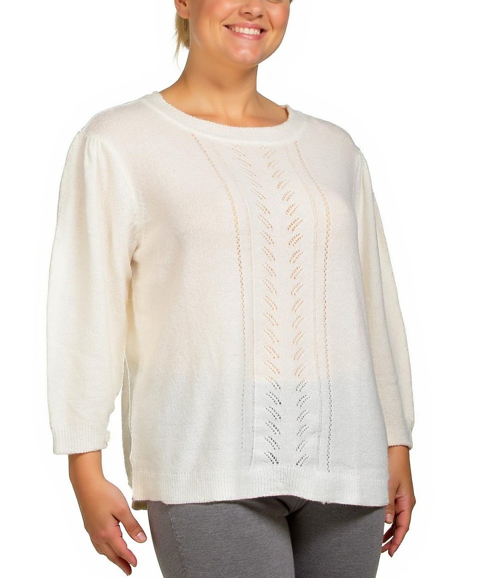 Дамският пуловер е в мек бял цвят с елегантен ажурен детайл в предната част. Изработен от приятна на допир материя, подходяща за есенно-зимния сезон. С овално деколте и ръкави с дължина до китката, той предлага комфорт и стил.