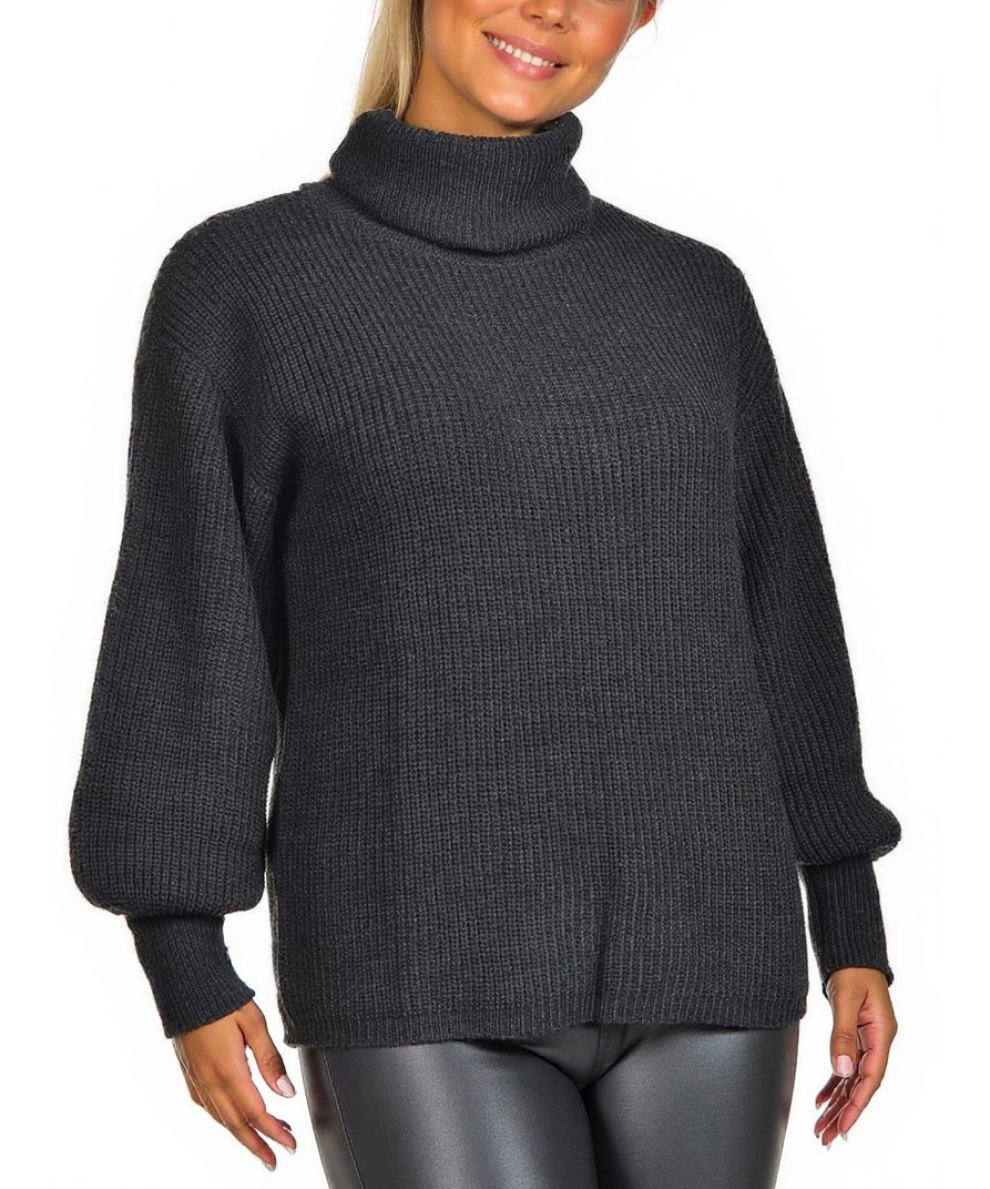 Тъмносив плетен дамски пуловер с висока поло яка. Свободен силует и обемни ръкави с прилепнали маншети. Мек, топъл и стилен модел за ежедневен и елегантен зимен аутфит. За офис и свободно ежедневие!!