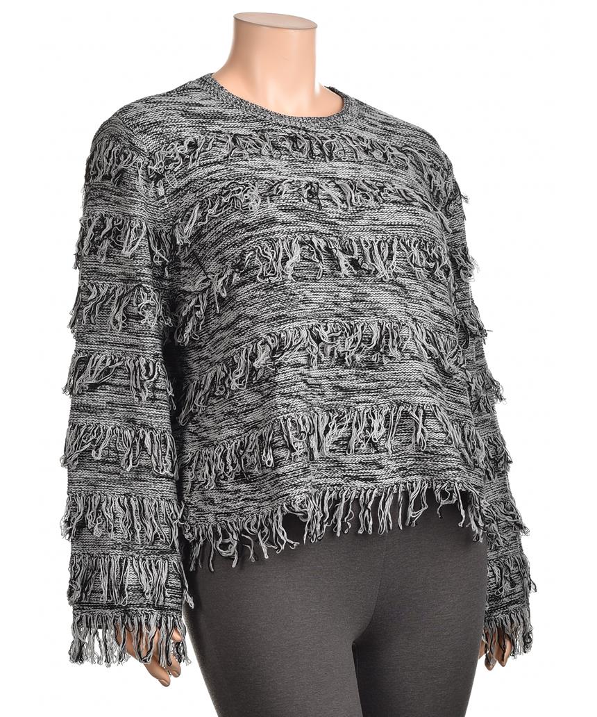 Дамски пуловер от памук, сиво-черен меланж с кръгло деколте и дълги ръкави. Свободна, къса кройка с ефектни ресни в хоризонтални редове, удобен и стилен за всекидневно носене. Лек и дишащ материал. 100%!