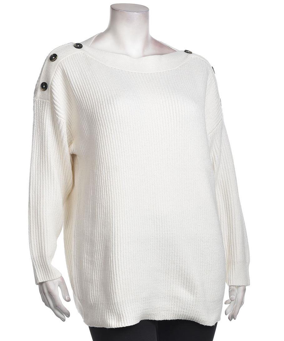 Бял дамски пуловер в свободен силует от плътна релефна плетка. Модерен дизайн с широко деколте и декоративни копчета на раменете. Топъл, удобен и лесен за комбиниране. Подходящ за есен и зима. Стилен.
