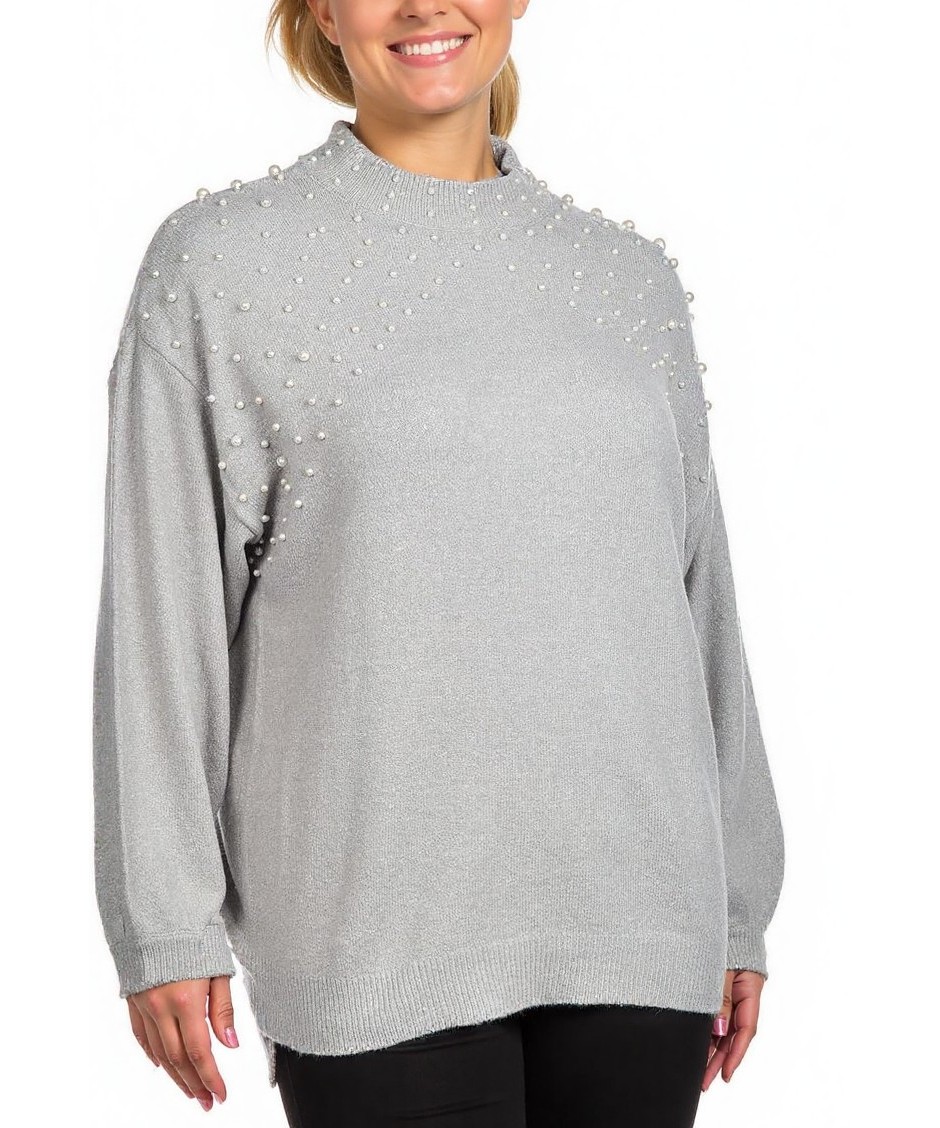 Елегантен дамски пуловер от памук в сив цвят с деликатни перли по раменете. Свободна кройка, дълги ръкави и ластична подгъвка за удобство. Мек, подходящ за ежедневие и офис стил. Подходящ за подарък