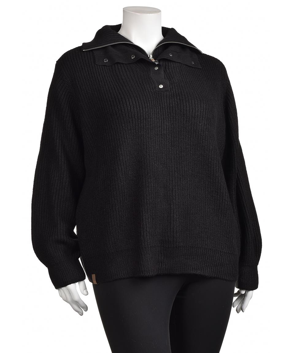 Елегантен дамски пуловер в черно, плетка с релефно плетиво, свободна кройка и дълги ръкави. Висока яка с цип и копчета за допълнителен стил и удобство. Перфектен за ежедневие и студено време. Подходящ