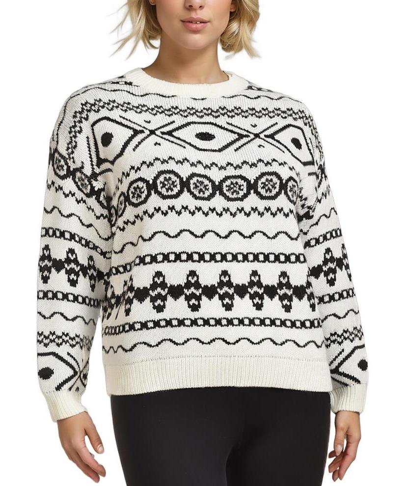 Мек дамски пуловер в бяло с черен северен мотив. Свободна кройка, дълги ръкави и кръгло деколте. Топъл, комфортен и лесен за комбиниране с дънки или пола. Подходящ за хладни вечери и подарък. Стилно!!