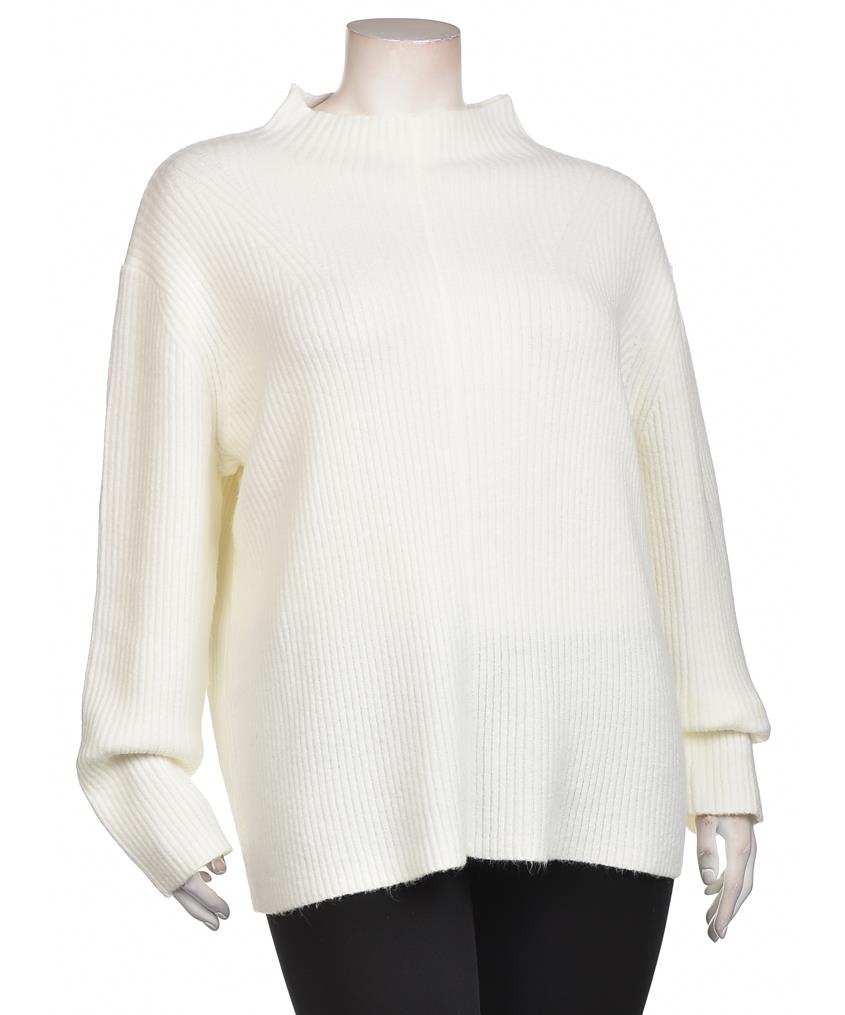 Мек дамски пуловер в кремаво бяло с висока права яка, релефно рипсено плетиво и разкроен силует. Удобен, топъл и стилен за ежедневно и елегантно облекло. Лек асиметричен подгъв и широки ръкави за модерен