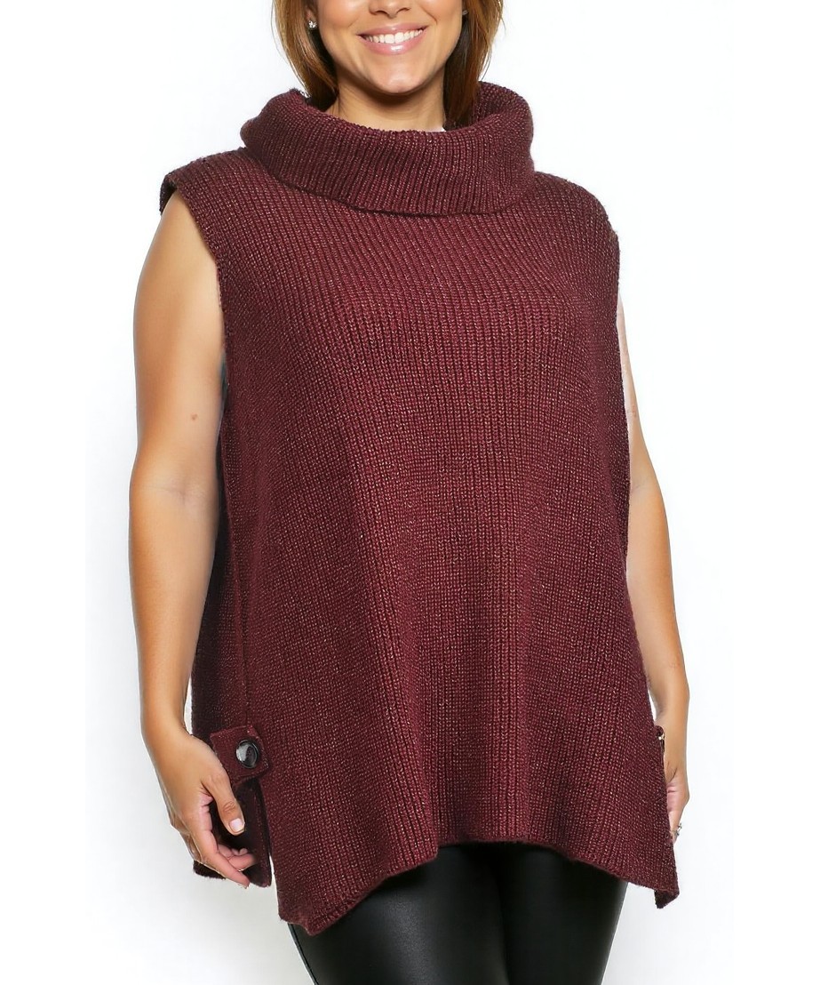 Елегантен дамски безръкав плетен пуловер в бордо с висок шал-яка. Свободен, удобен силует с небрежен подгъв и декоративни копчета на страничните разрези. Идеален за ежедневен стил. Идеален с дънки!!!!