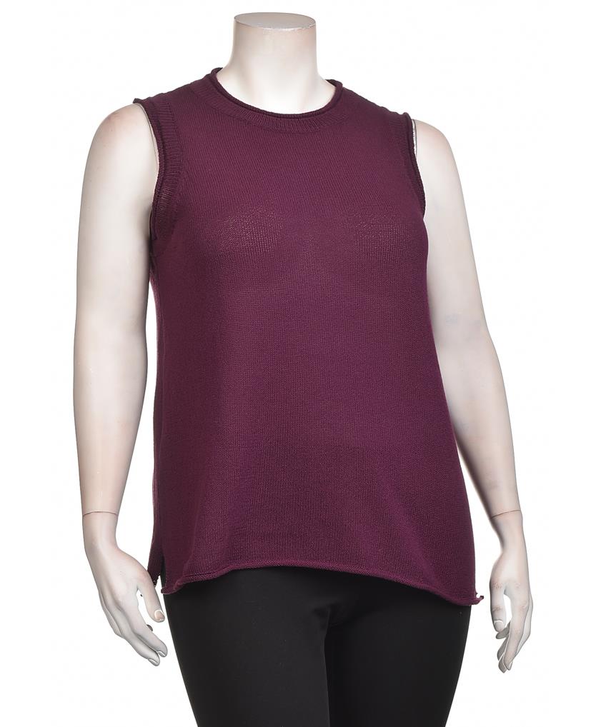 Елегантен дамски пуловер от 100% памук в тъмно бордо. Без ръкави, свободен силует и фина плетка за комфорт и дишане. Подходящ за ежедневие и офис, лесен за поддръжка.