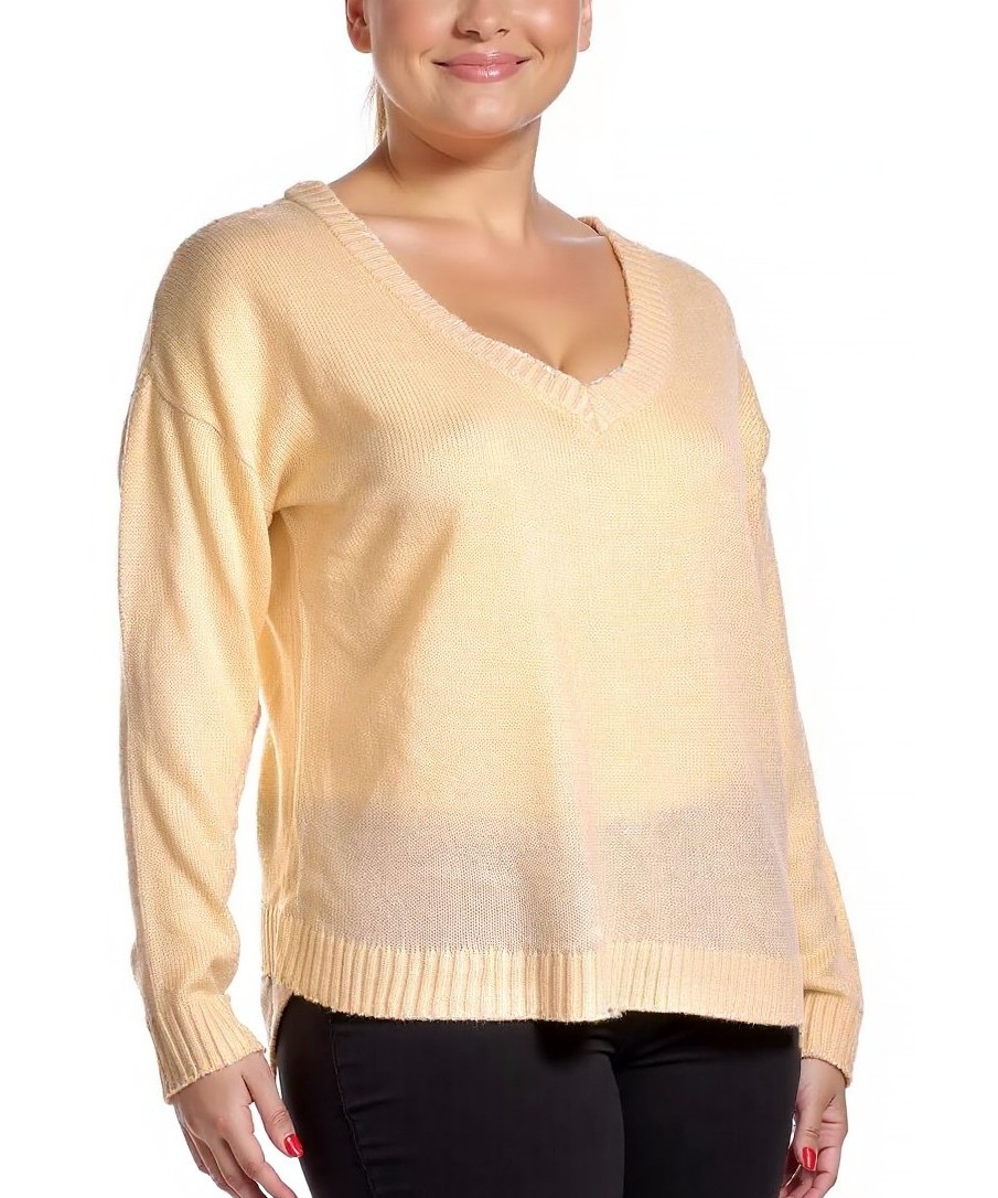 Дамски пуловер в нежно жълт цвят, мек и лек трикотаж с V-образно деколте. Свободна кройка, рипсени маншети и подгъв, подходящ за ежедневие и слоеве. Лесен за поддръжка, подходящ за пролет, есенна.