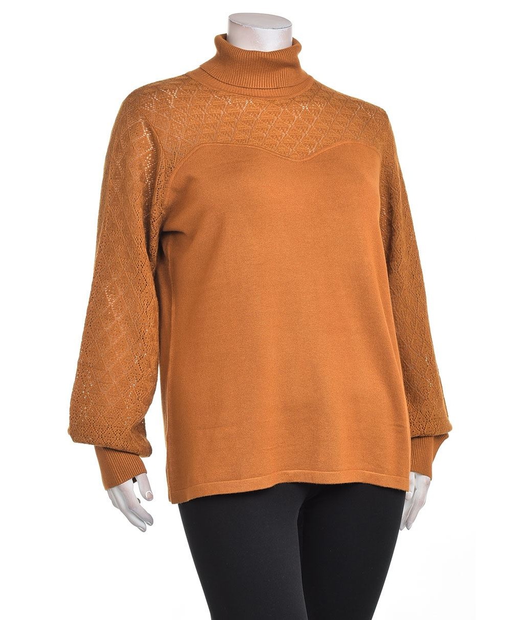 Елегантен дамски пуловер от вискоза в топъл кехлибарен тон. Висока яка, мека изработка и релефни ажурни ръкави. Свободна кройка, удобен за всеки ден и по-официални визии. Идеален за есен-зима, модерен