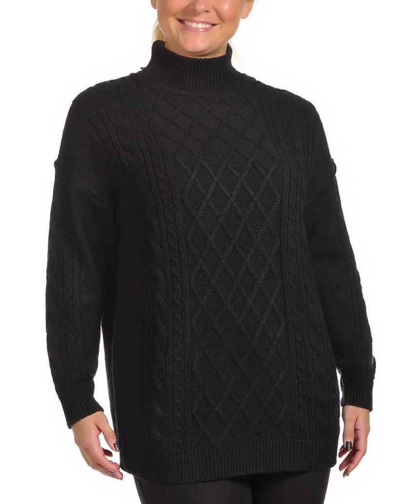 Топъл дамски пуловер в тъмносиньо/черно с висока яка и плетена аранирана шарка отпред. Свободен, дълъг модел с дълги ръкави и еластични маншети — стилен и удобен за студеното време. Перфектен за всеки ден