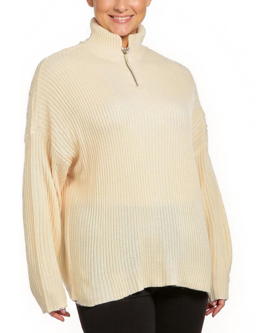 Елегантен дамски пуловер в кремав нюанс от рипсен плет, с висока яка, къс цип с метален пръстен, дълги свободни ръкави и разкроена кройка Подходящ за всеки гардероб.