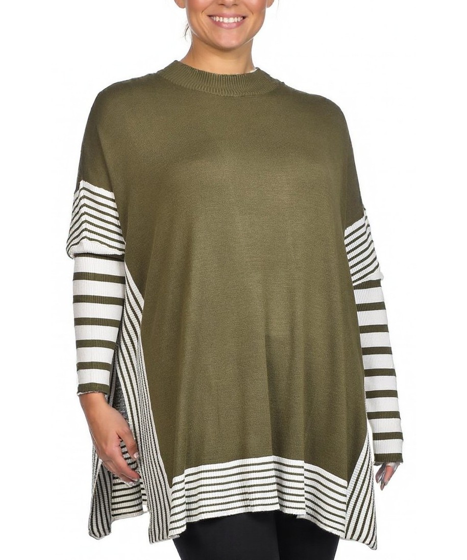 Елегантен дамски пуловер от вискоза в маслено зелено с контрастни бели райета на ръкавите и подгъва. Свободен силует, дълги ръкави и мека, дишаща плетка за комфорт и стил. Съчетава се с дънки и боти!!