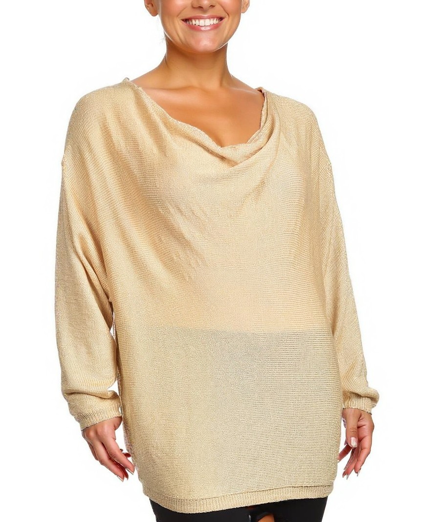 Елегантен дамски пуловер в цвят шампанско, свободен силует с ефектно водопадно деколте и дълги ръкави. Мека, лека трикотажа за стилен и удобен ежедневен аутфит. Подходящ за дънки пола и елегантни обувки