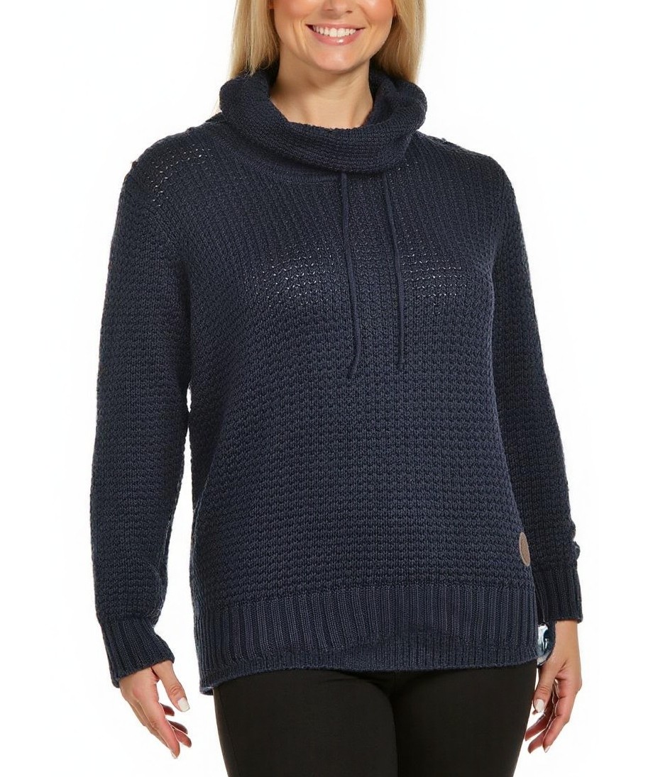 Дамски памучен пуловер в тъмносиньо с обемен поло-як и връзки, плътна текстурирана плетка, дълги ръкави и ластични маншети, ластичен долен ръб. Свободна мека кройка, подходящ за ежедневно носене. ТОП