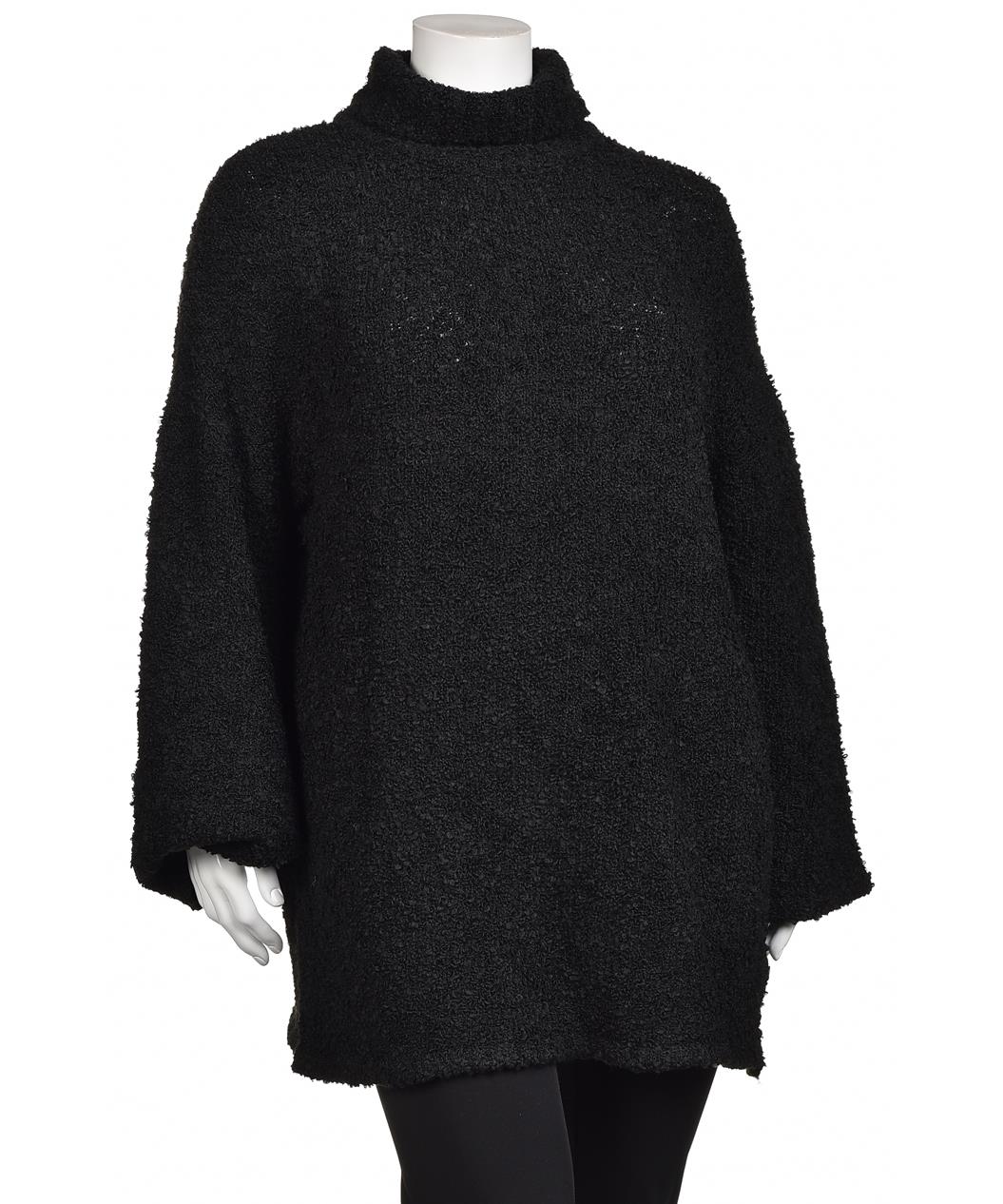 Черна дамска плетена блуза-пуловер с висока яка, меко пухкаво покритие и свободна, удължена линия. Удобен, топъл модел за ежедневно носене, комбинира се лесно с дънки или клин. Подходящ за есен-зима.