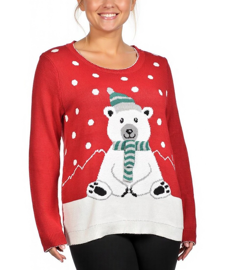 Червен дамски пуловер от памук с кокетна полярна мечка в шал и снежинки. Мек и топъл, идеален за зимни дни и празници. Удобна кройка, лесна поддръжка, машинно пране. Налични размери S-XL. Безплатно!!!