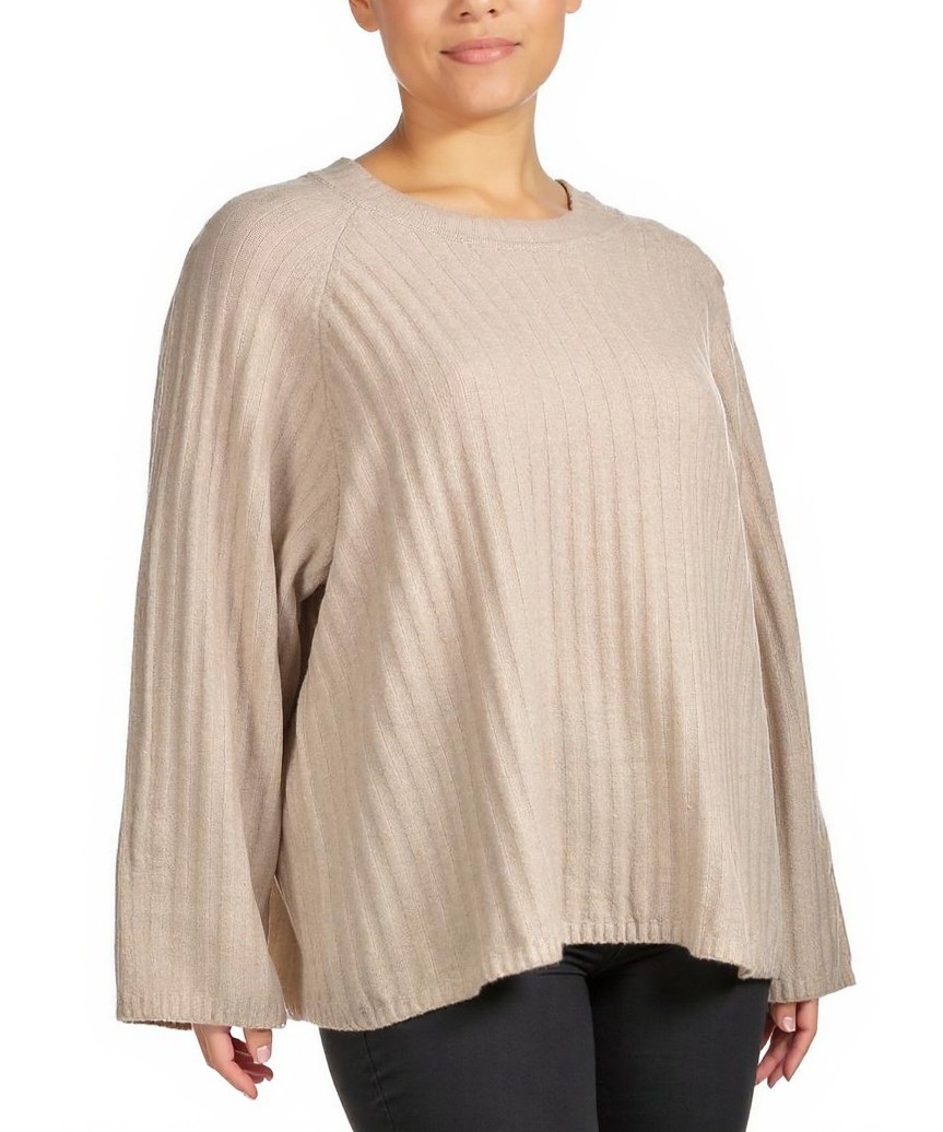Бежов дамски пуловер с релефно рипсено плетиво и широк, свободен силует. Топъл, мек и удобен модел за ежедневна елегантност. Лесно се комбинира с дънки и панталон. Подходящ за преходни и студени сезони!!