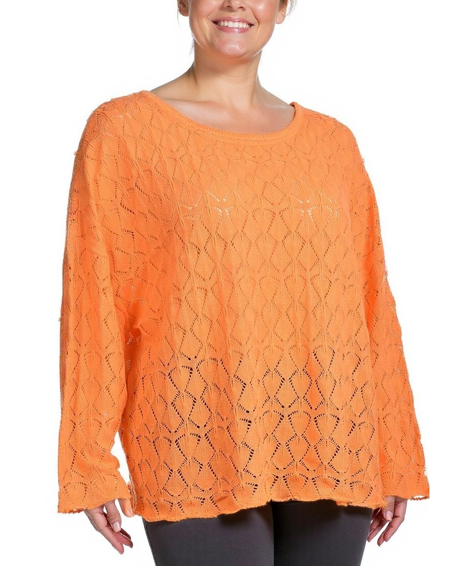 Дамски памучен пуловер в ярко оранжево с ажурен плетен десен. Свободна кройка, широки ръкави и кръгло деколте. Мек, дишащ и удобен за всеки ден. Подходящ за офис и пролетни разходки. Лесна поддръжка.