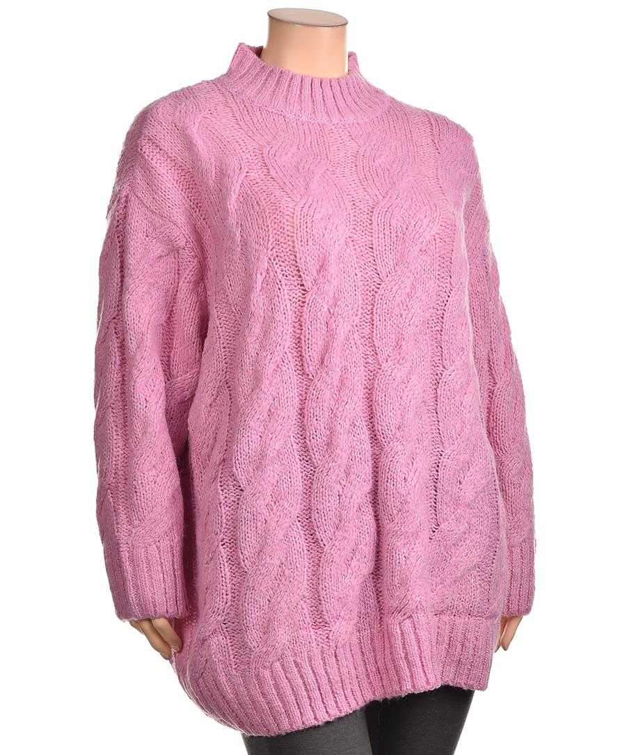 Розов дамски пуловер с ефектна плитка, мек и пухкав, свободен oversize силует, висока рипсена яка, рипсени маншети и долен подгъв. Топъл и стилен за ежедневие и студено време. Подходящ за подарък. Топ