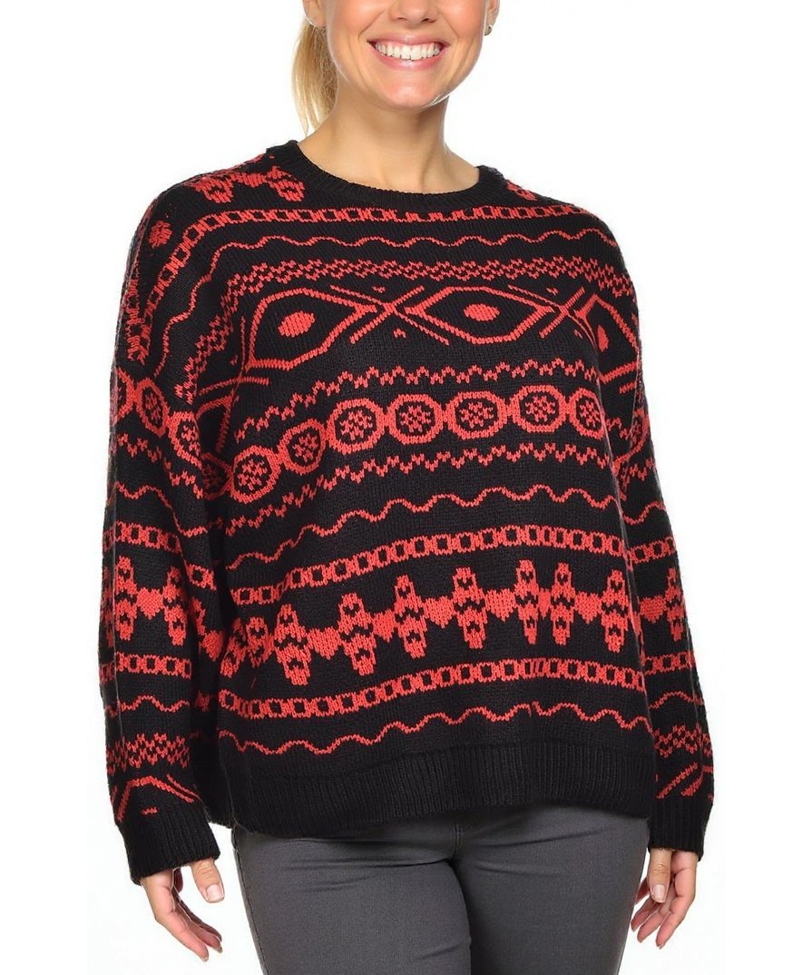 Дамски пуловер в черно и червено с жакардов етно десен. Оверсайз силует, кръгло деколте и дълги ръкави. Мек, топъл трикотаж. Подходящ за ежедневие, работа и празнични изяви. Идеален за студено време.!!!