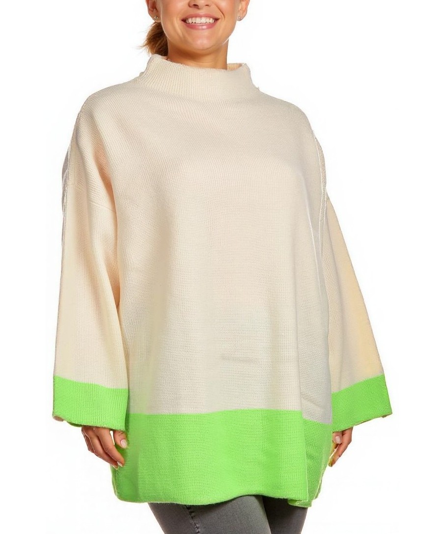 Модерен дамски пуловер с широк свободен силует и мека плетка. Светъл крем цвят с контрастни неоновозелени кантове на долната част и ръкавите. Висока яка, топъл и удобен. Перфектен за всеки ден. Стилен! XL.