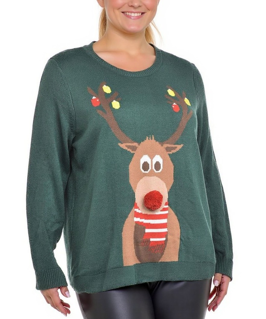 Дамски тъмнозелен пуловер с весел коледен елен, червен помпон на носа и раиран шал. Удобна, леко свободна кройка, дълги ръкави и плетена текстура — перфектен за празнични и ежедневни аутфити. Комфорт.