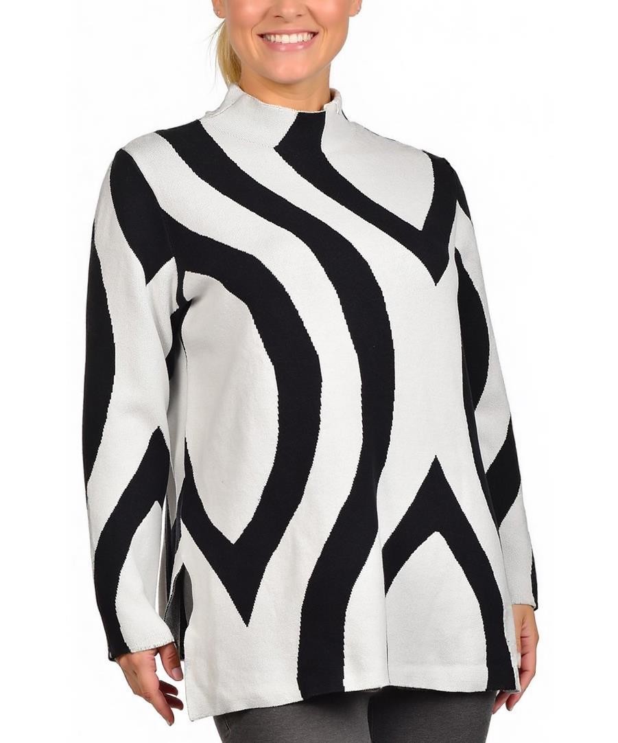 Памучен дамски пуловер с висока яка и дълъг ръкав. Черно-бял абстрактен десен, мека материя, права кройка. Идеален за ежедневен и елегантен градски стил. Подходящ за работа, срещи и свободно време....