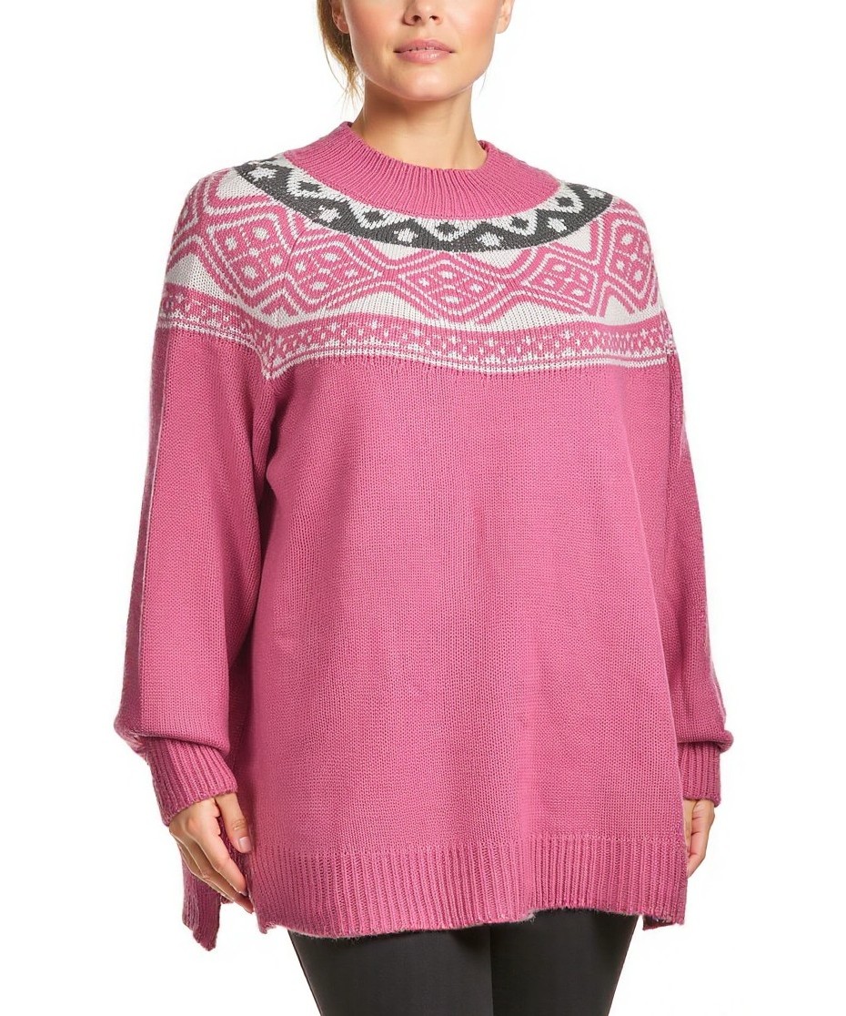 Розов дамски пуловер с едро плетиво и ефектен скандинавски мотив в бяло и сиво при раменете. Овърсайз кройка, рипсен подгъващ ръкав и долна част, странични цепки. Топъл и удобен. Подходящ за зимата!!