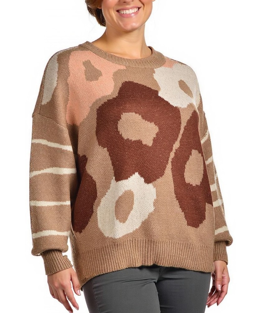 Уютен дамски пуловер с леко оувърсайз прилягане, мека плетка и кръгло деколте. Земни тонове в графичен цветен десен, ребриста долна част и маншети. Идеален за ежедневен и топъл стил. Модерен и удобен.