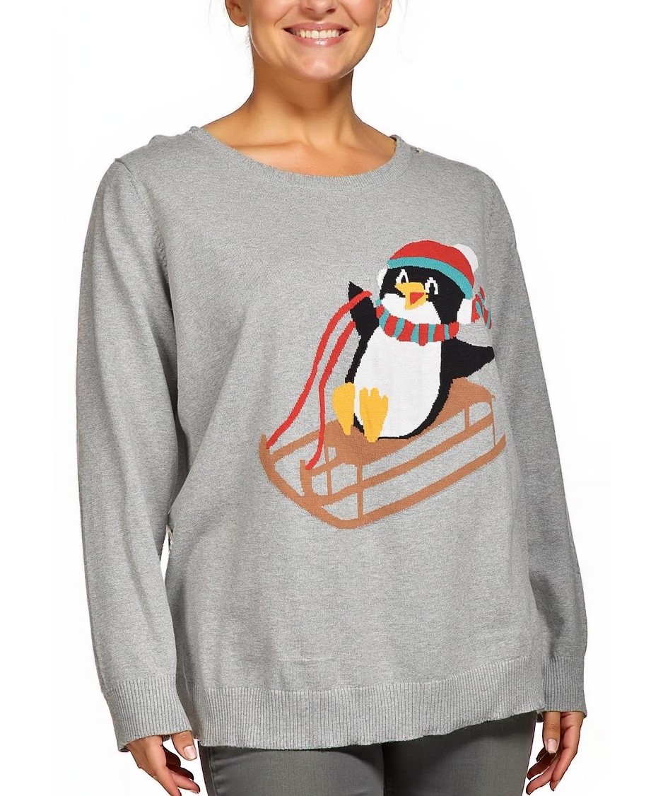 Дамски памучен пуловер в светлосив цвят с игрив пингвин на шейна. Мек и дишащ, с обло деколте и дълги ръкави. Уютен и стилен избор за ежедневие и празнични моменти. Лесна поддръжка подходящ за подарък.