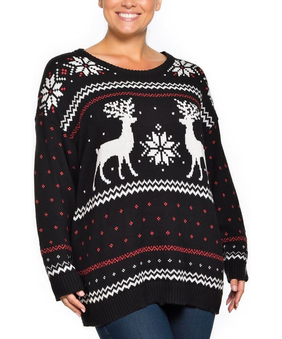 Дамски памучен пуловер в свободен силует, мек и топъл. Черна основа с бели елени и снежинки и дискретни червени акценти. Дълги ръкави и плетена ластична долна част — идеален за зимни дни. За подарък.