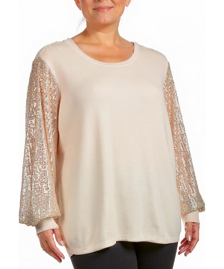 Елегантен дамски пуловер от вискоза в кремаво с релаксиран силует и кръгло деколте. Дълги прозрачни ръкави украсени със златисти пайети придават празничен блясък. Мек и удобен за всеки ден. Много мек.