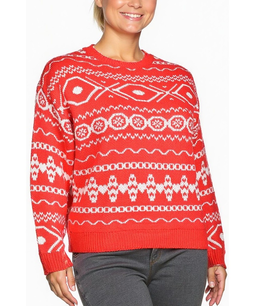 Дамски пуловер в наситено червено с бели фолклорни мотиви. Свободна кройка, кръгло деколте, рипсени маншети и подгъв. Топъл, мек и подходящ за ежедневни и празнични визии.