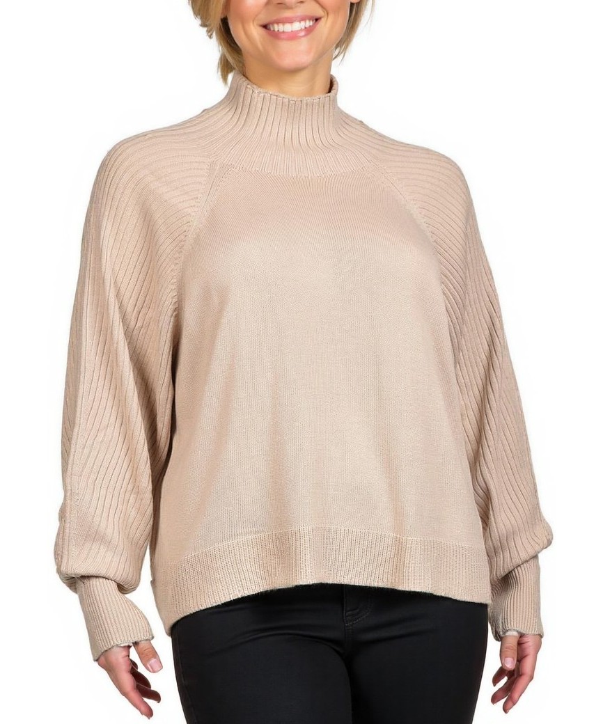 Бежов дамски пуловер от мек трикотаж с висока поло яка. Свободен силует с обемни реглан ръкави, релефни маншети и подгъв. Топъл, елегантен и лесен за комбиниране. Перфектен за сезон. Практичен, лесен.
