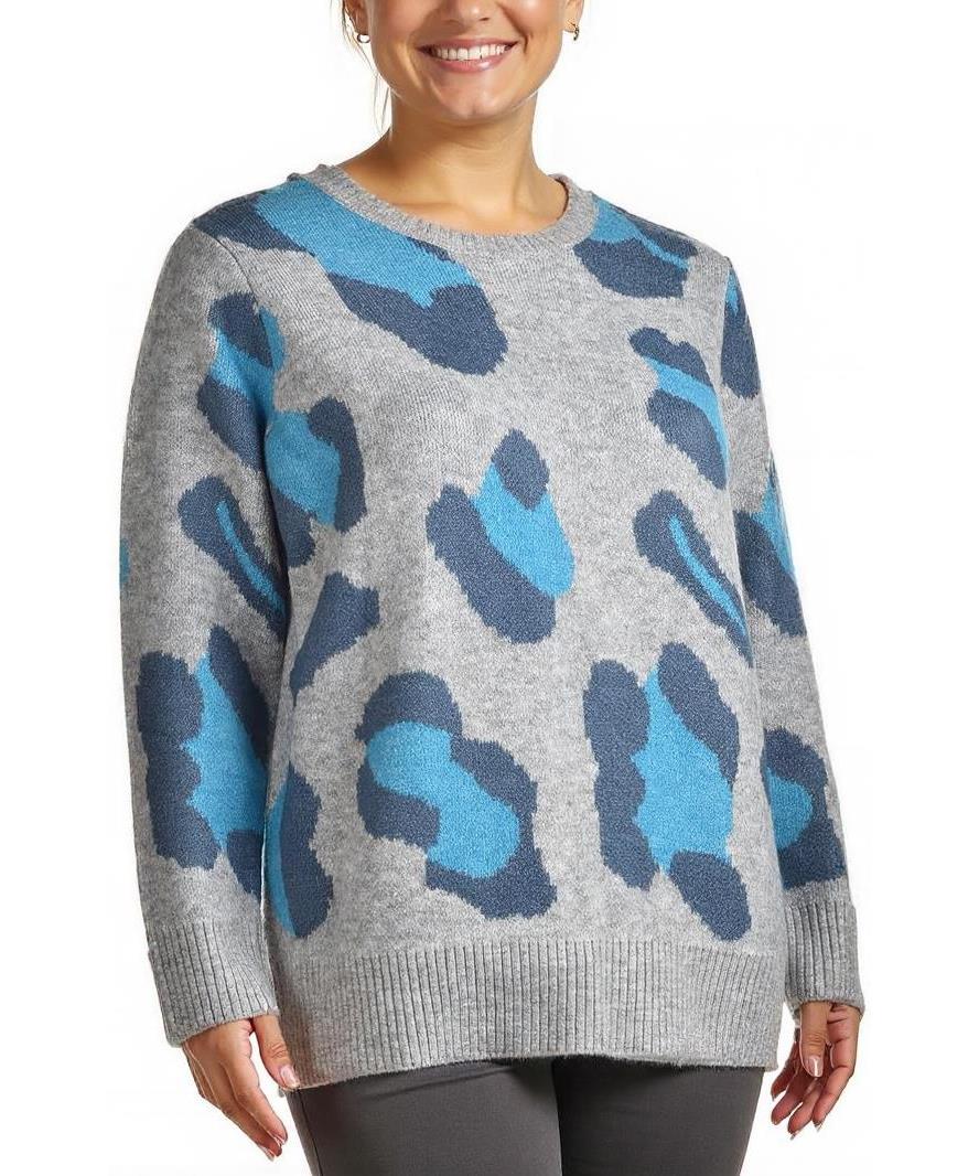 Дамски топъл плетен пуловер в сив меланж с модерен синьо-тъмносин леопардов десен. Прав силует, кръгло деколте, дълги ръкави и рипсени маншети и долен борд – удобен и стилен избор за зимата. Елегантно