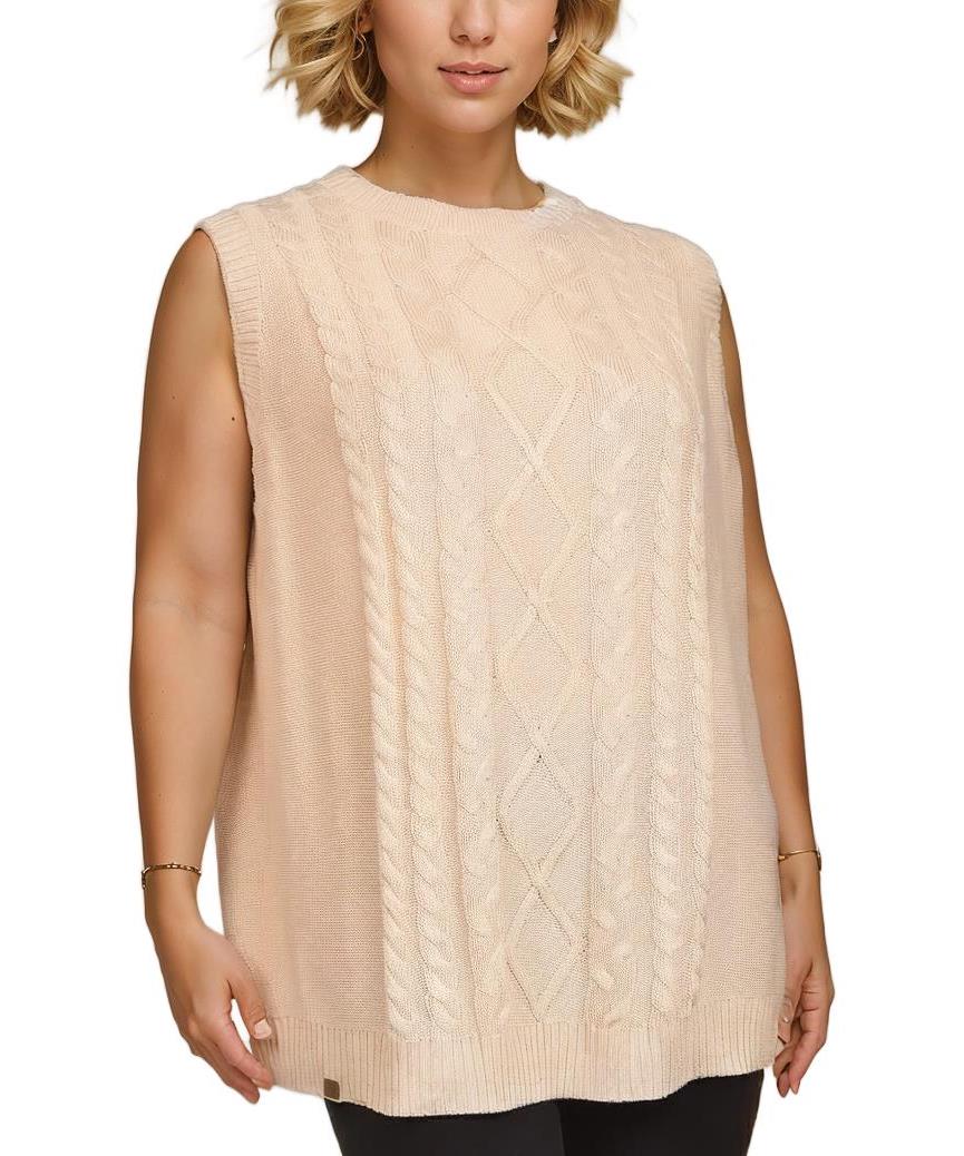 Дамски памучен пуловер без ръкави, плетен с фигурални плитки. Свободен, удобен силует, кръгло деколте и къса платка по ръба. Мек, дишащ материал в нежен бежов тон за стилни слоеве. Подходящ за всеки.