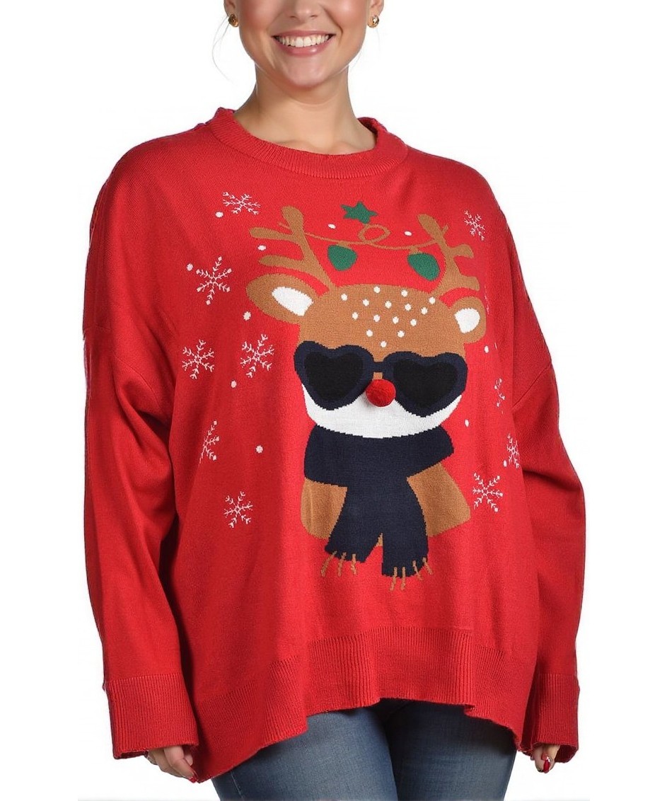 Червен дамски коледен пуловер с весело еленче в слънчеви очила, помпон като нос, шал и снежинки. Удобен, свободен силует, мек плет, идеален за празнични и ежедневни зимни визии. Перфектен и за подарък.