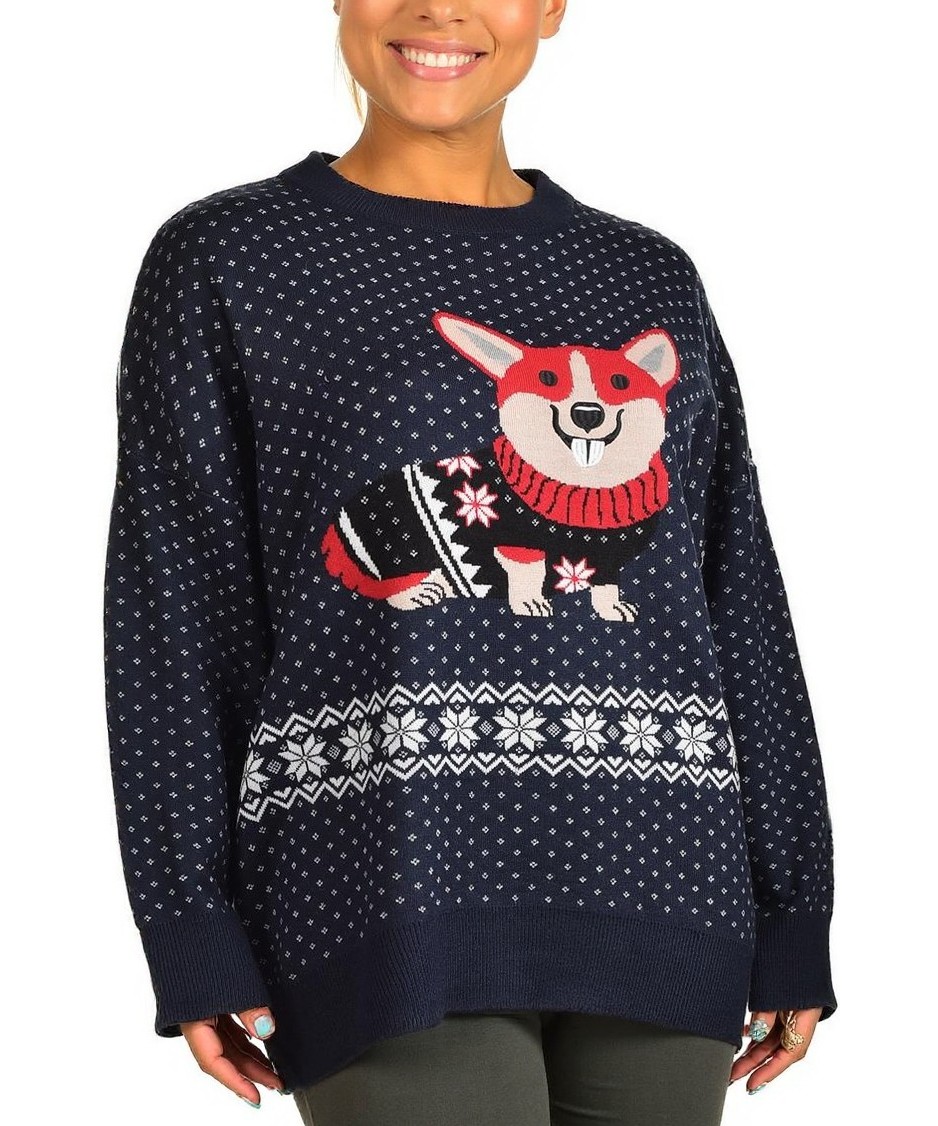 Дамски плетен пуловер тъмносиньо с коледен мотив — усмихнат корги в червено и бяло. Уютен, с дълъг ръкав и свободна кройка, топъл и мек материал. Идеален за зимни и празнични визии.