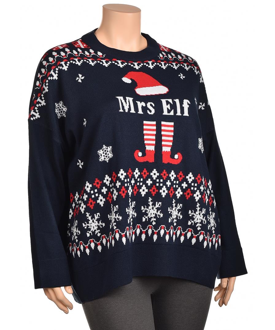 Тъмносин дамски пуловер с коледна щампа Mrs Elf — смешна шапка и райе чорапи, снежинки и фолклорен орнамент. Удобна кройка, мек трикотаж, подходящ за празнични поводи и ежедневие. Машинно пране до 30°