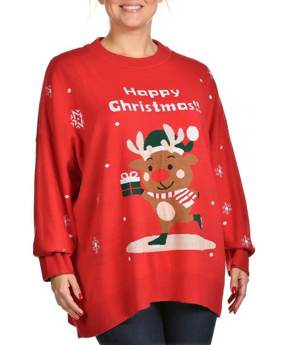 Червен дамски коледен пуловер с весела картинка на елен и надпис "Happy Christmas!". Удобен, широк силует, рипсен деколте и маншети, мек, топъл, идеален за празнични дни и подарък. Практичен и стилен.