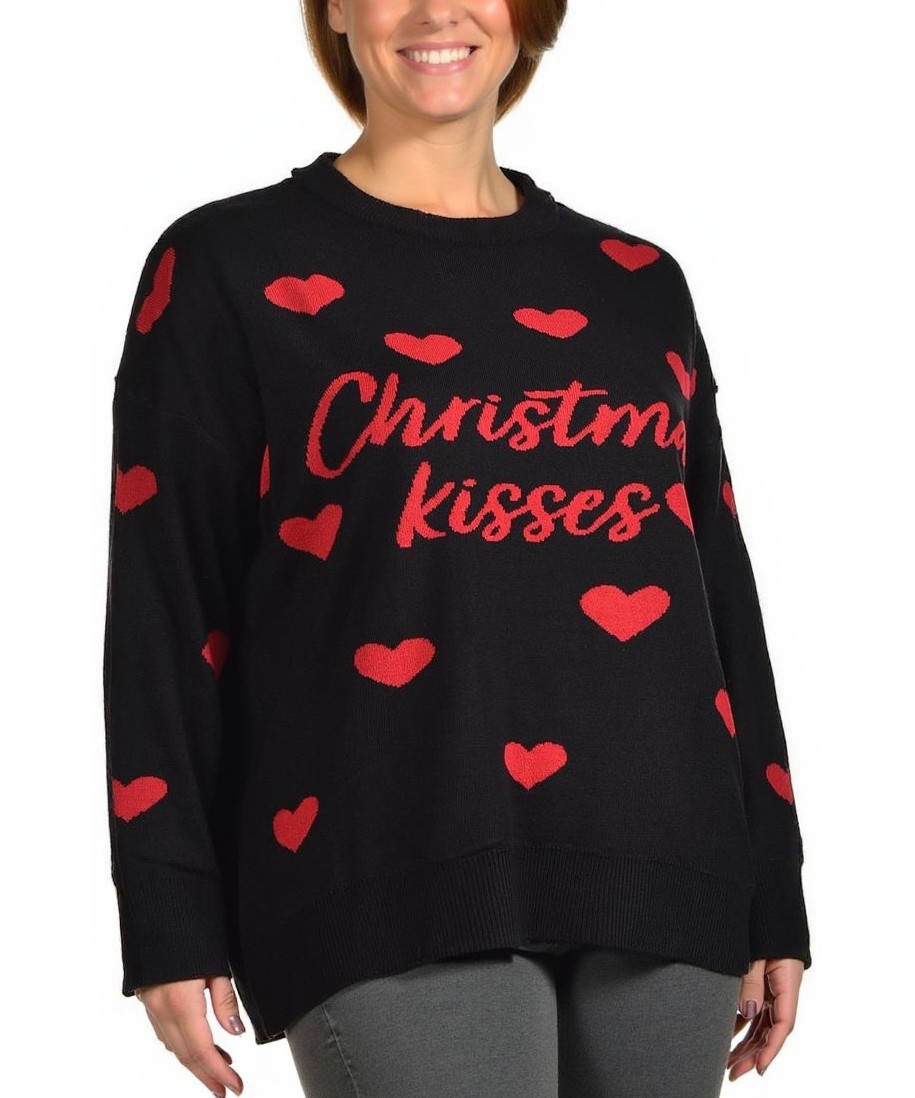 Черен дамски пуловер с червени сърца и надпис „Christmas kisses“. Свободна кройка, дълги ръкави, плътна материя. Идеален за уютни празнични визии, подарък и ежедневен комфорт. Наличен в S-XXL. Стил.