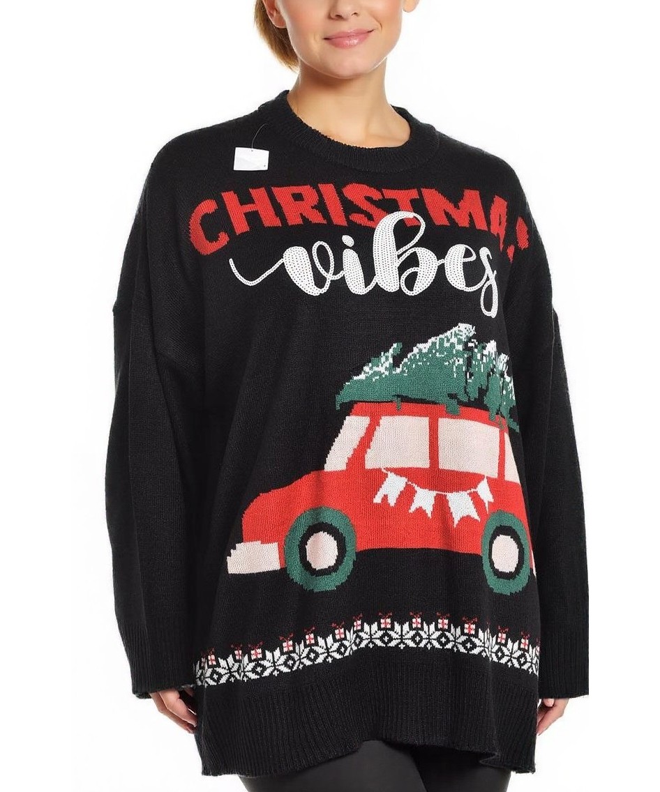 Дамски плетен пуловер 'Christmas vibes', oversize кройка, мек и топъл, в черно с коледна картина - червена кола и елха. Удобен за празнични дни, модерен и лесен за комбиниране. Стилен за празнични дни