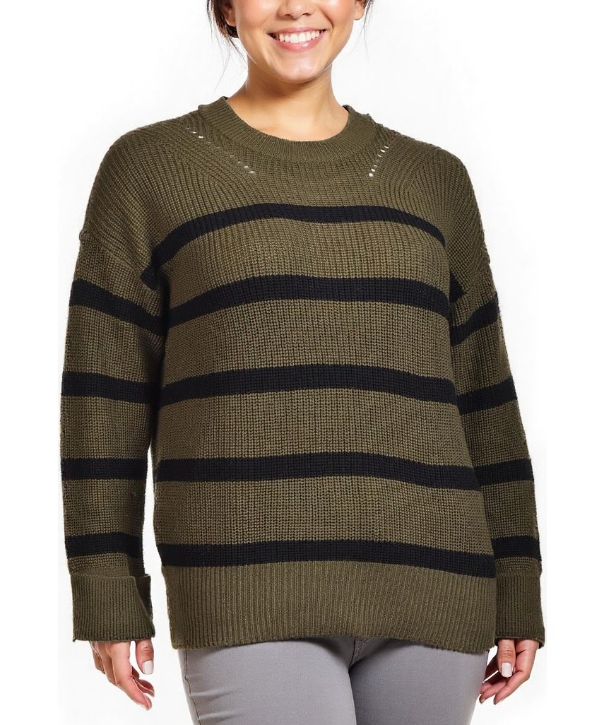 Дамски вълнен пуловер, модел oversize в маслинено зелено с черни райета. Кръгло деколте, дълги ръкави и рипсен подгъв. Топъл, мек и подходящ за ежедневен стил. Топъл, мек и лесен за комбиниране. стил.